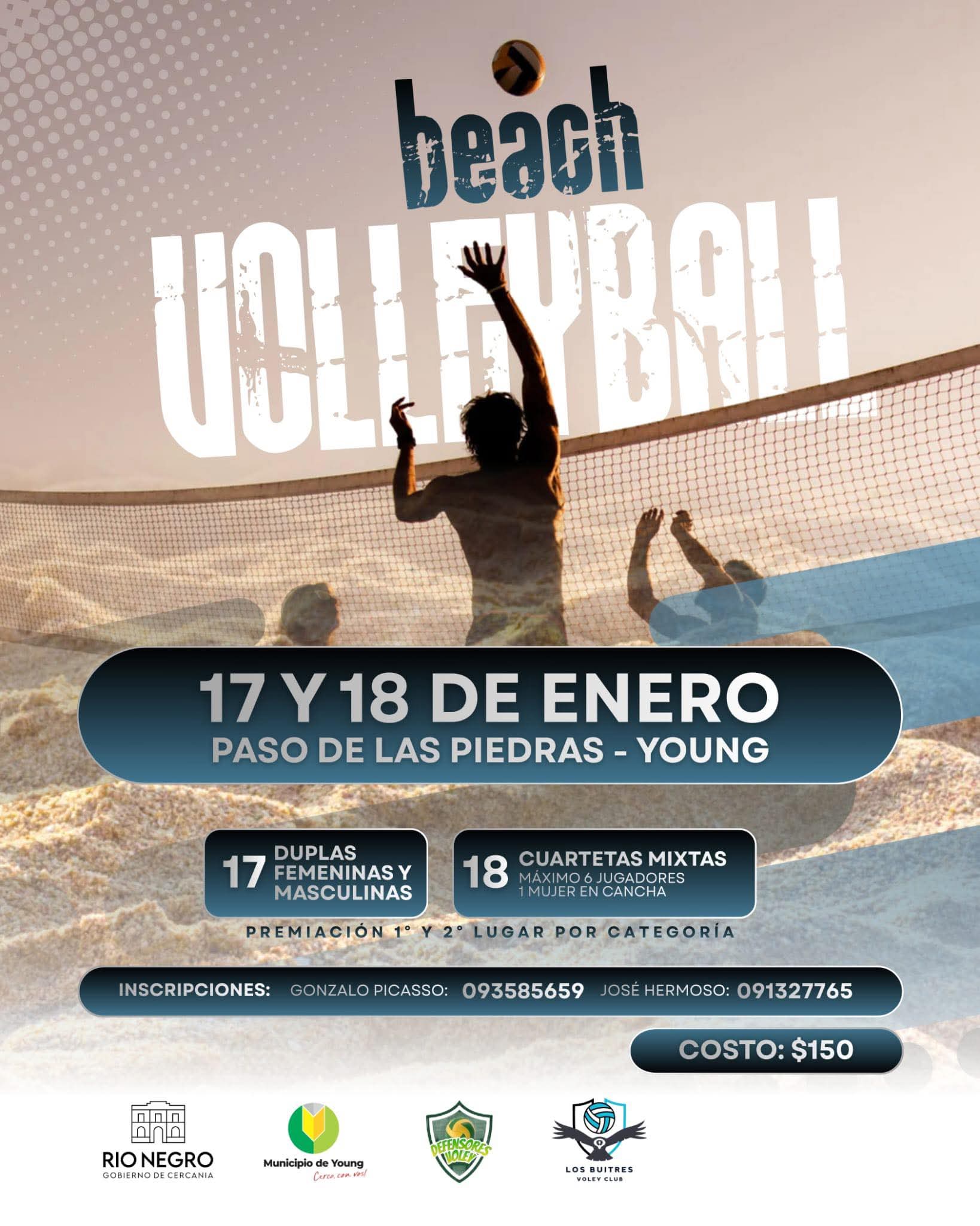 La Intendencia de Río Negro, junto al Municipio de Young y clubes locales, invita a participar del torneo de beach vóley que se desarrollará los días 17 y 18 de enero en la playa de Paso de las Piedras, en la ciudad de Young.