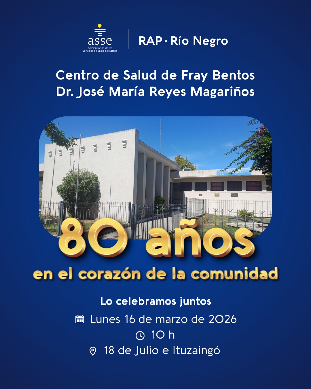 El Centro de Salud de Fray Bentos Dr. José María Reyes Magariños, perteneciente a la Red de Atención Primaria (RAP) de Río Negro de ASSE, celebrará sus 80 años de trayectoria al servicio de la comunidad.