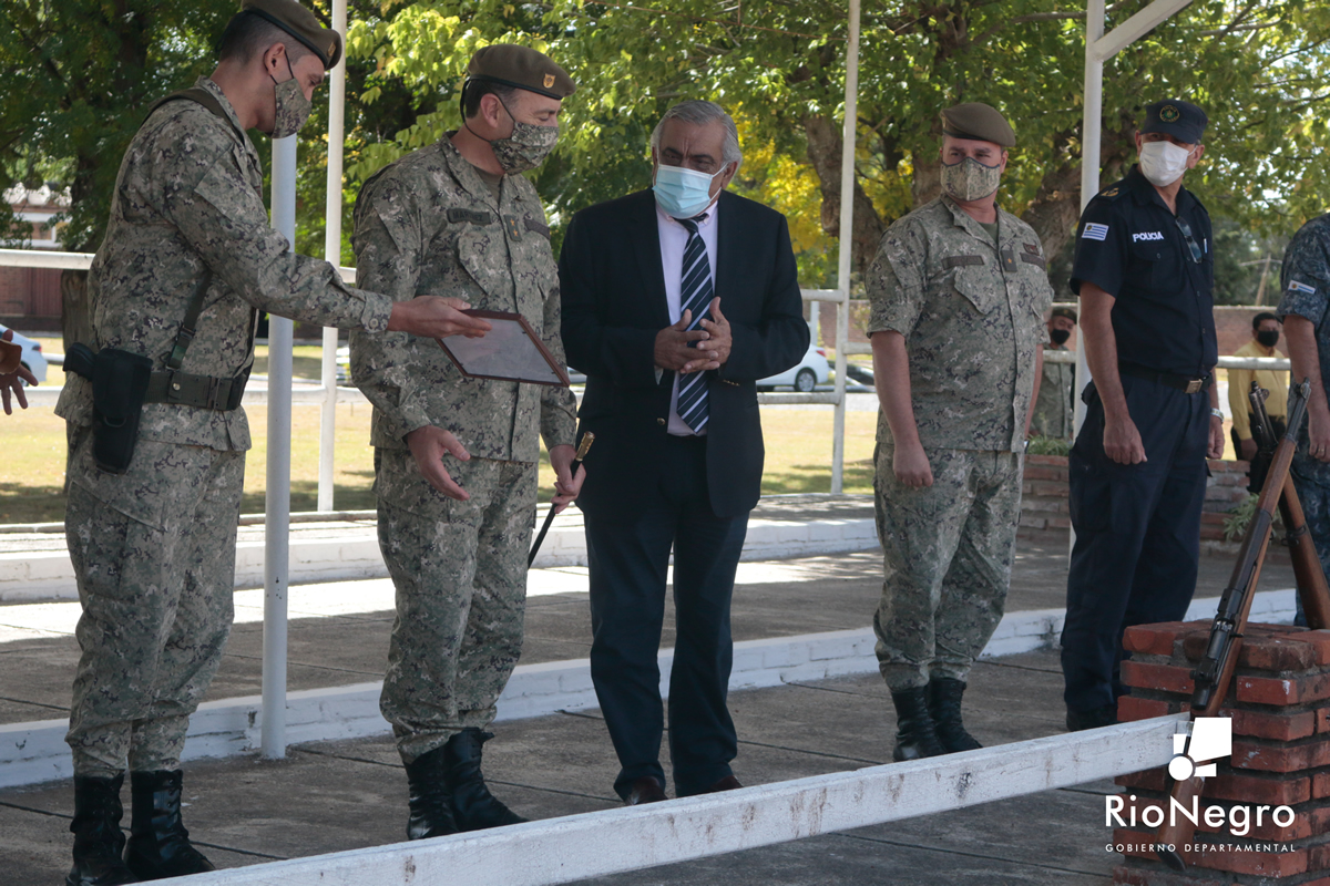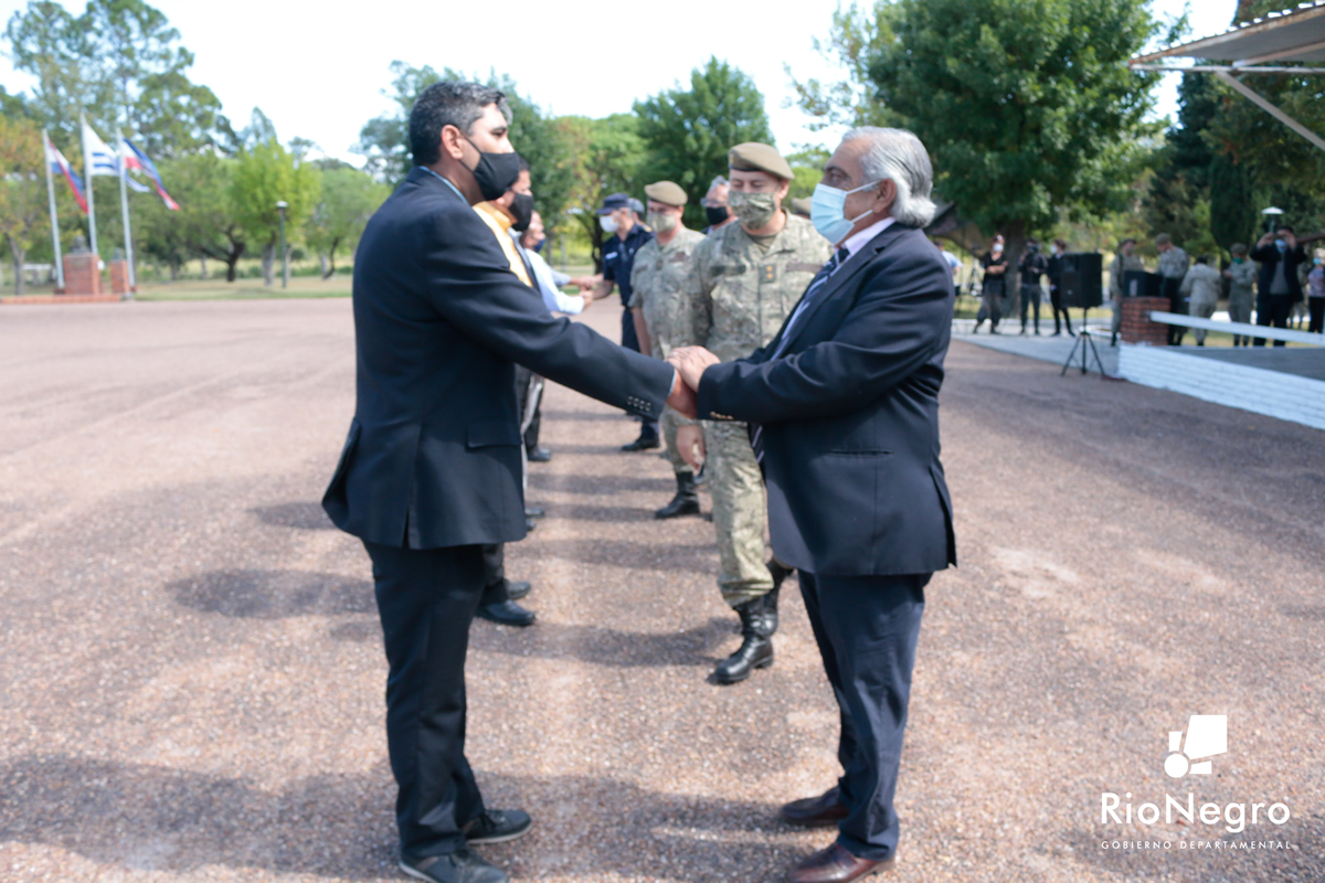 Junto a las demás autoridades presentes, se procedió a presenciar el acto desarrollado en la Plaza de Armas del Batallón de Infantería Mecanizada de Fray Bentos, acompañando también el reconocimiento que recibieron los efectivos que pasaron a retiro en el último año.
