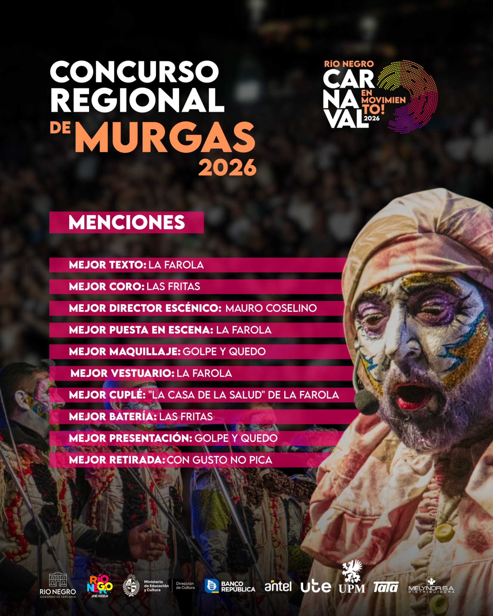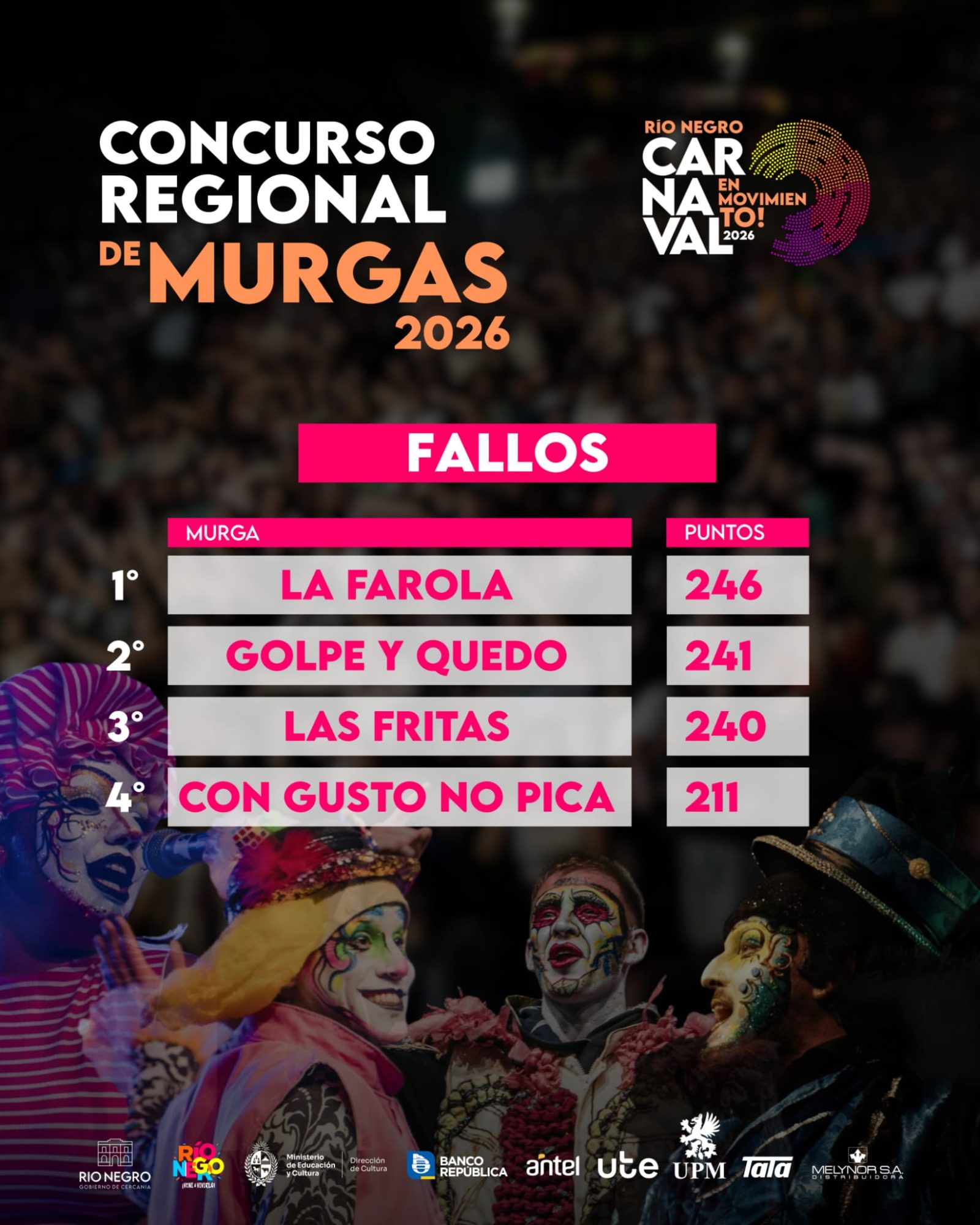La Intendencia de Río Negro informa que el jurado del Concurso Regional de Murgas 2026 culminó el proceso de evaluación y dejó asentados los resultados definitivos en el acta oficial labrada ante escribano público.