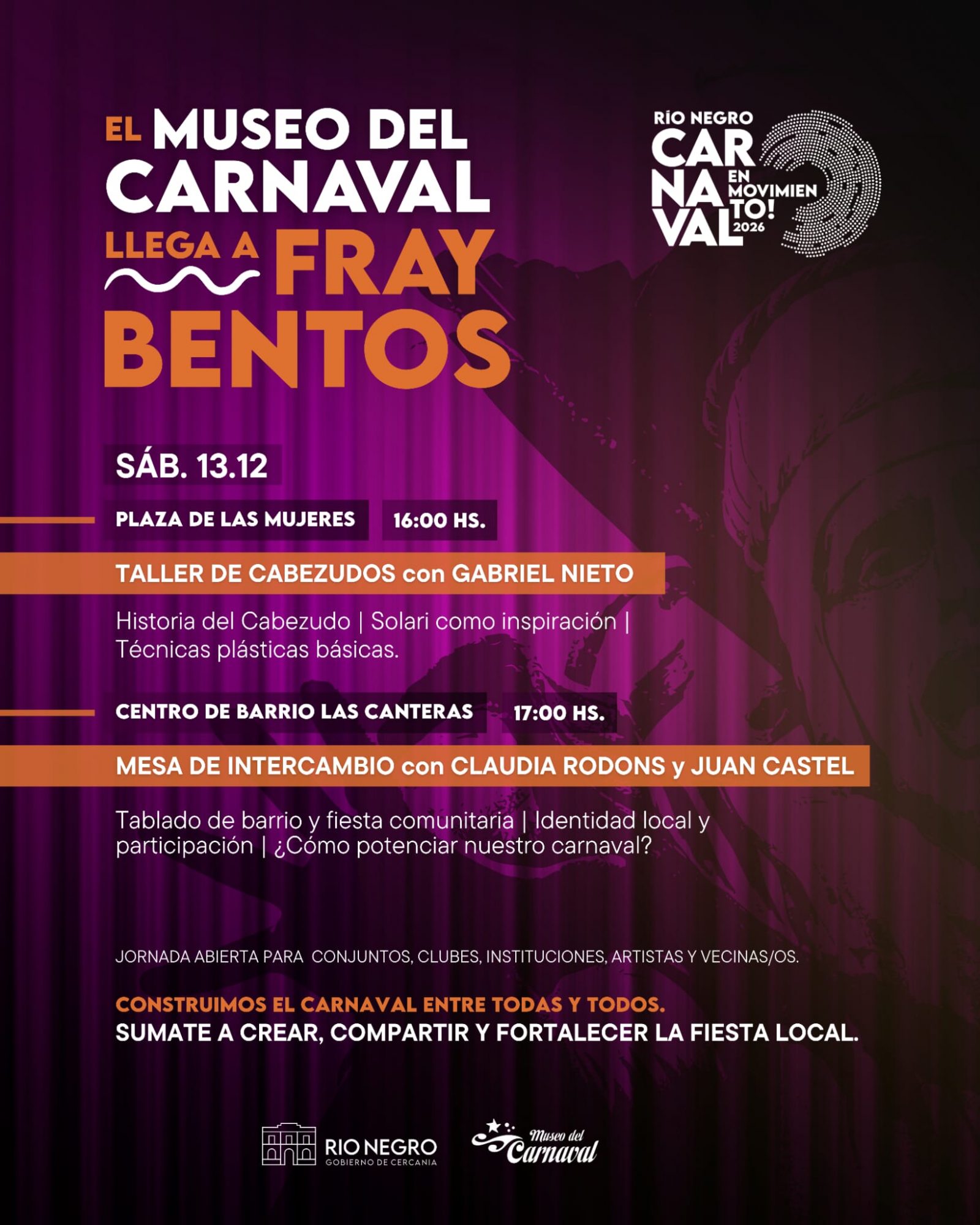 Este sábado 13 de diciembre, Fray Bentos recibirá a un equipo del Museo del Carnaval, que desarrollará una jornada especial con talleres y una mesa de intercambio abierta a todos los grupos, protagonistas y amantes del carnaval.