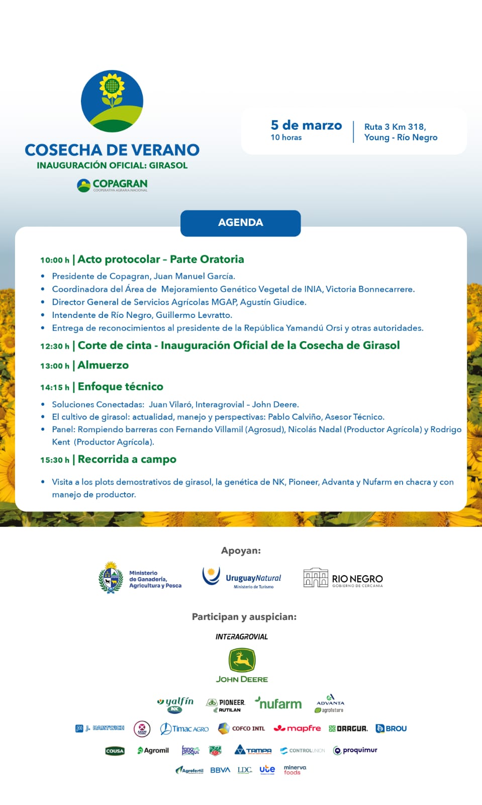 La jornada, organizada por Copagran, comenzará a las 10:00 con el acto protocolar y la parte oratoria. Posteriormente se llevará a cabo el corte de cinta, dejando formalmente inaugurada la cosecha de girasol.