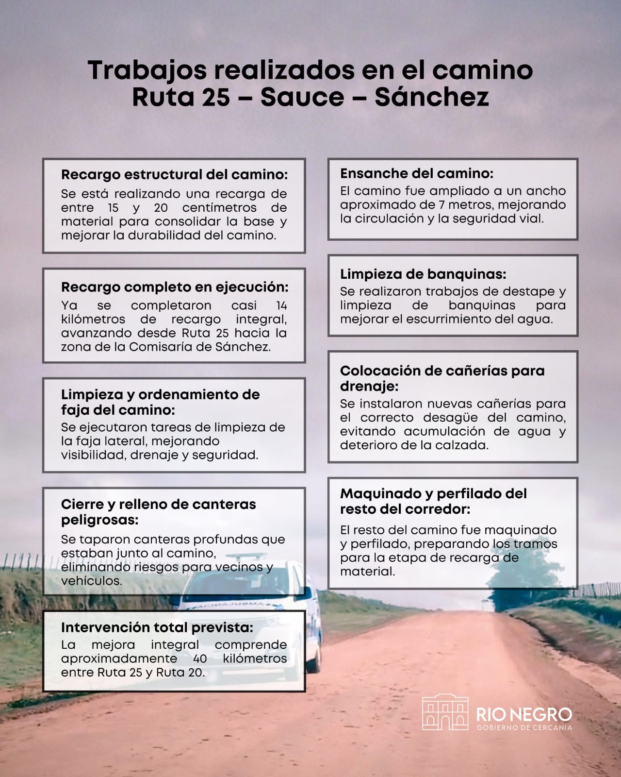 Asimismo, se ratificó el compromiso asumido de que el tramo del camino entre la Ruta 20 y la Ruta 25 continuará siendo intervenido por la cuadrilla de vialidad rural del Gobierno Departamental, con el objetivo de consolidar las mejoras y garantizar que la circulación no afecte derechos ni servicios esenciales de la comunidad.