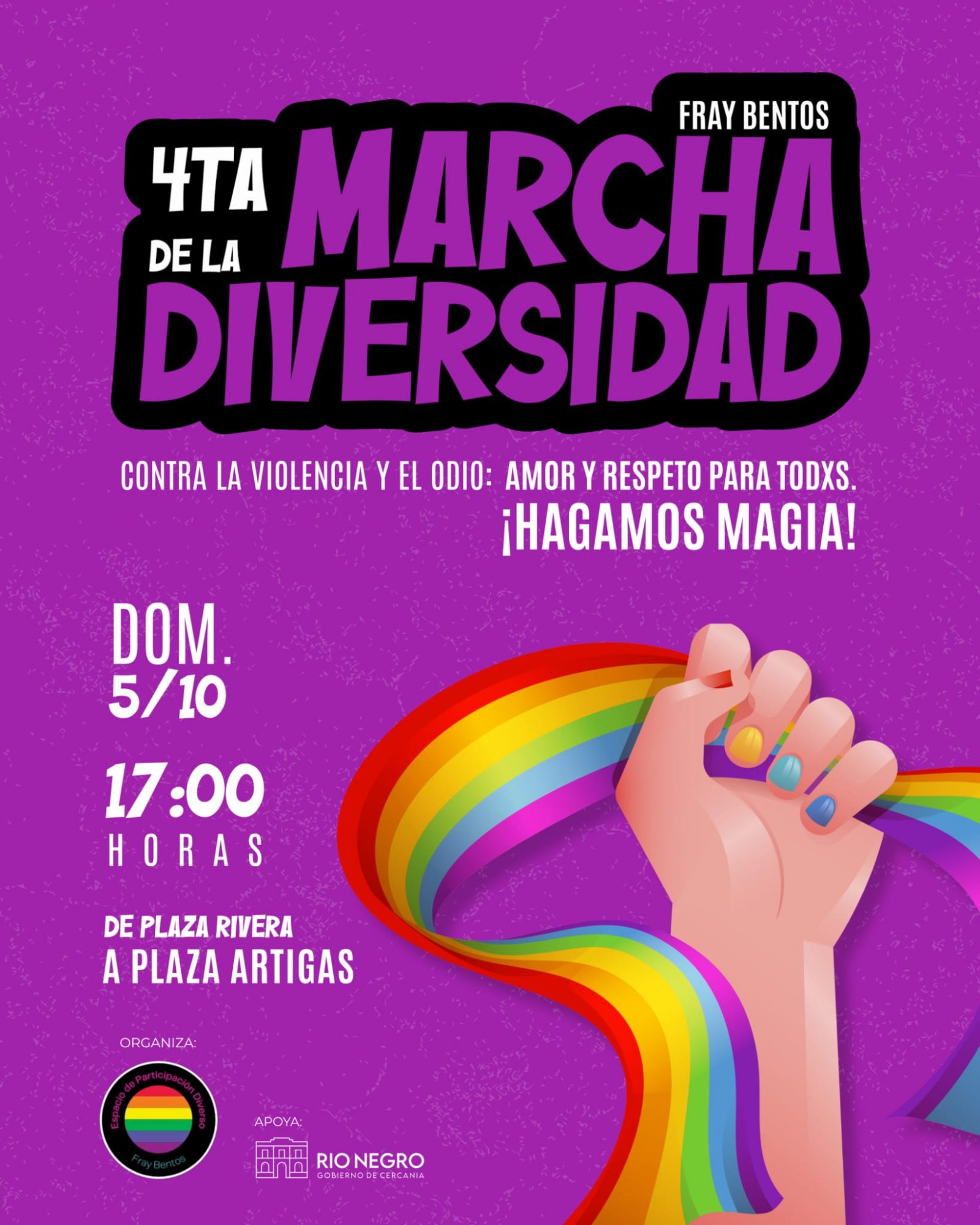 Este domingo 5 de octubre se realizará en Fray Bentos la 4ª Marcha de la Diversidad, bajo la consigna “Contra la violencia y el odio: amor y respeto para todxs. ¡Hagamos magia!”.