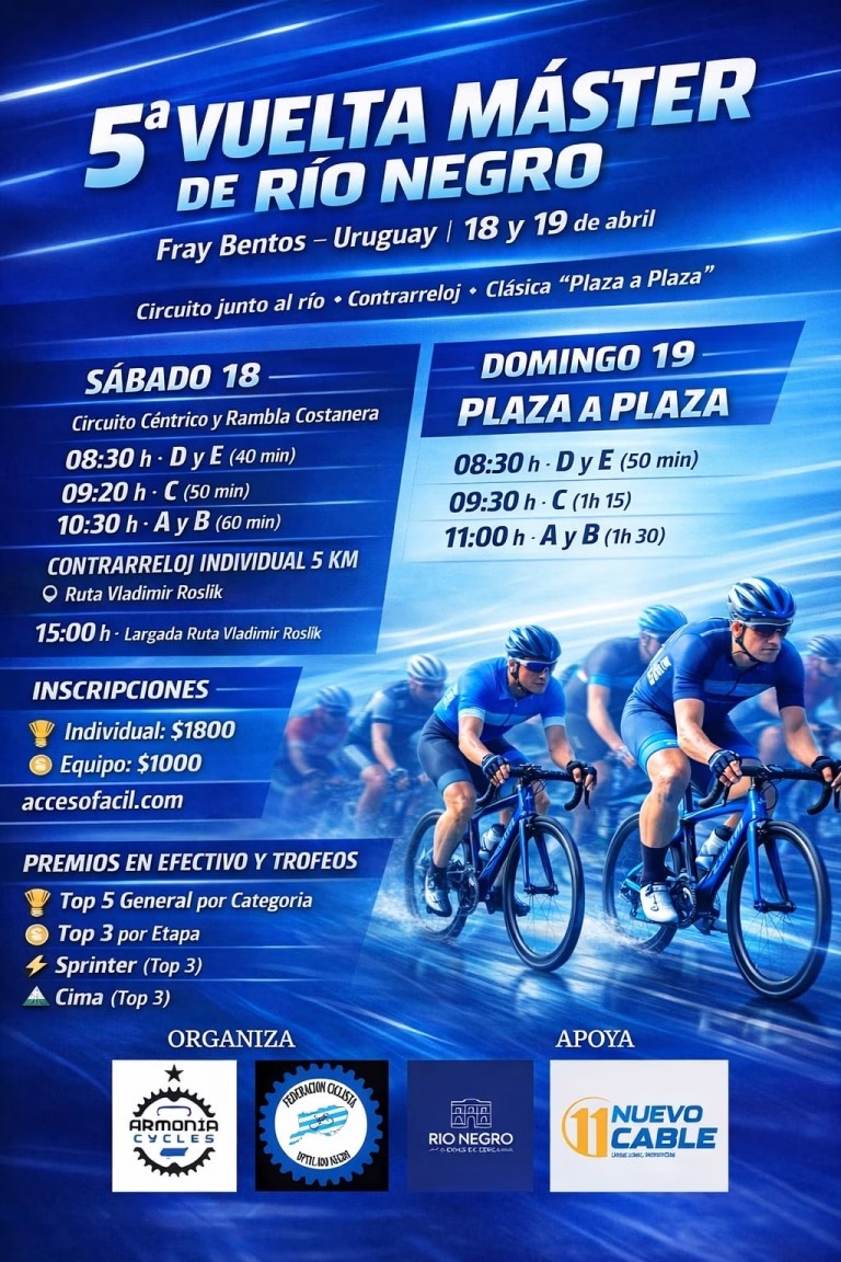 Los días 18 y 19 de abril se disputará en Fray Bentos la 5ª Vuelta Máster de Río Negro, competencia ciclística que reunirá a corredores de varias categorías en dos jornadas de actividad.
