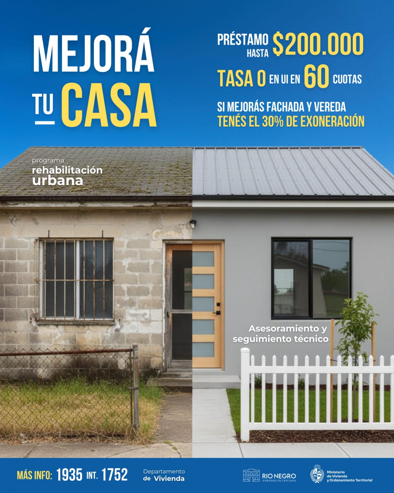 La Intendencia de Río Negro presentó oficialmente “Mejorá Tu Casa”, un programa de crédito destinado a que las familias de Fray Bentos, Young, San Javier y Nuevo Berlín puedan mejorar, ampliar o renovar sus viviendas mediante un préstamo sin intereses y acompañado por asistencia técnica municipal.