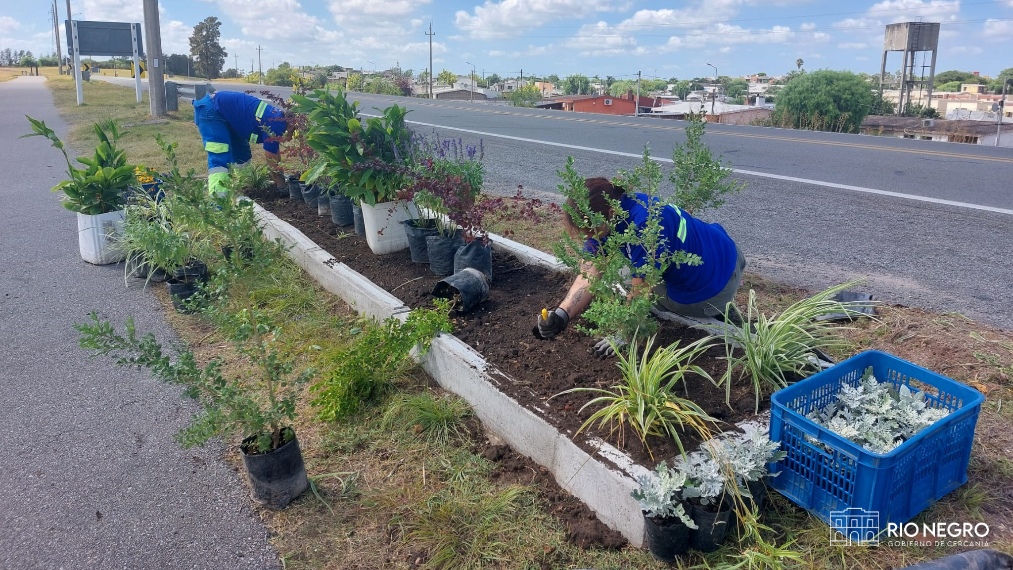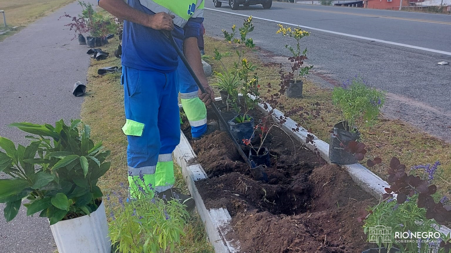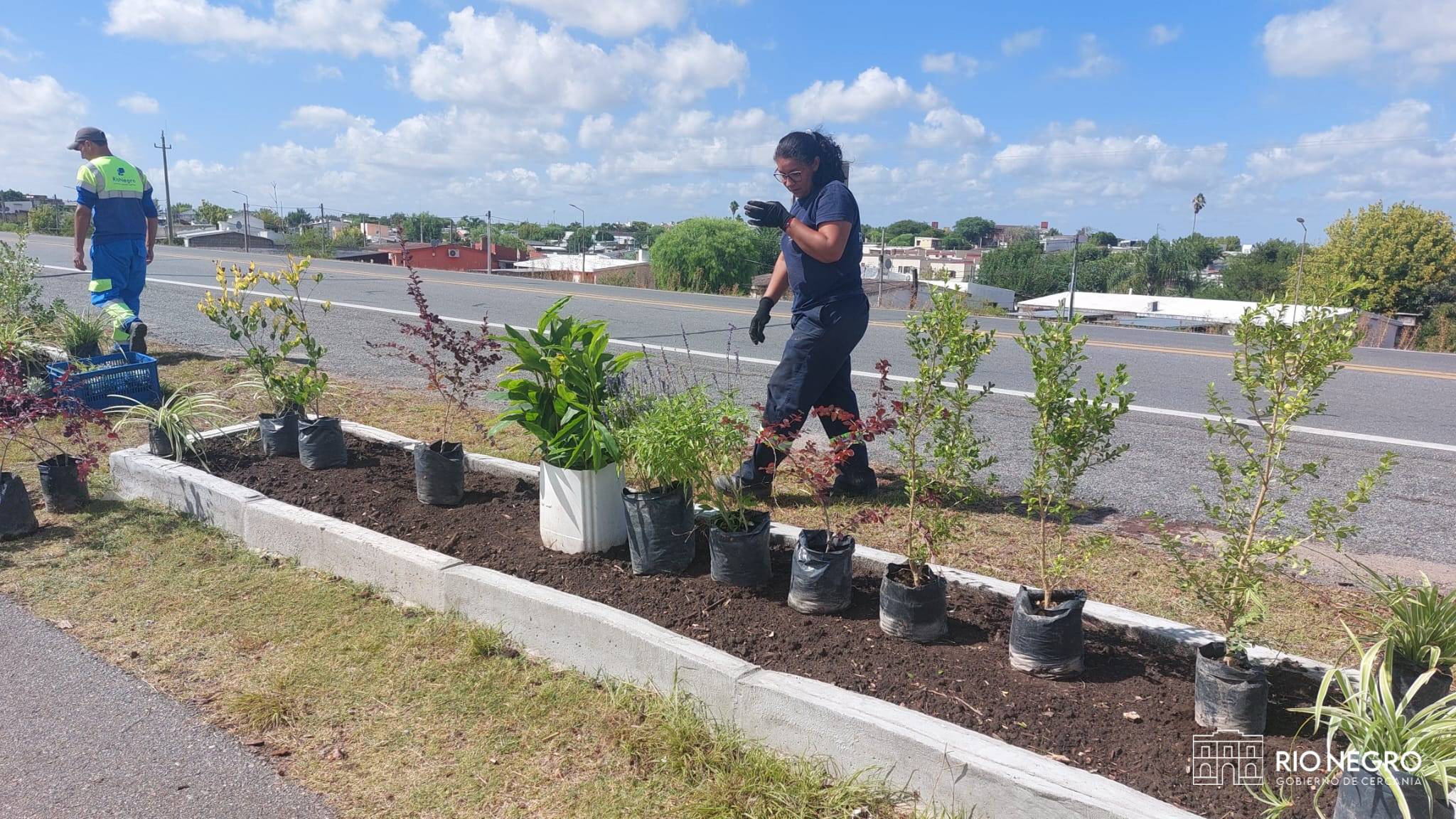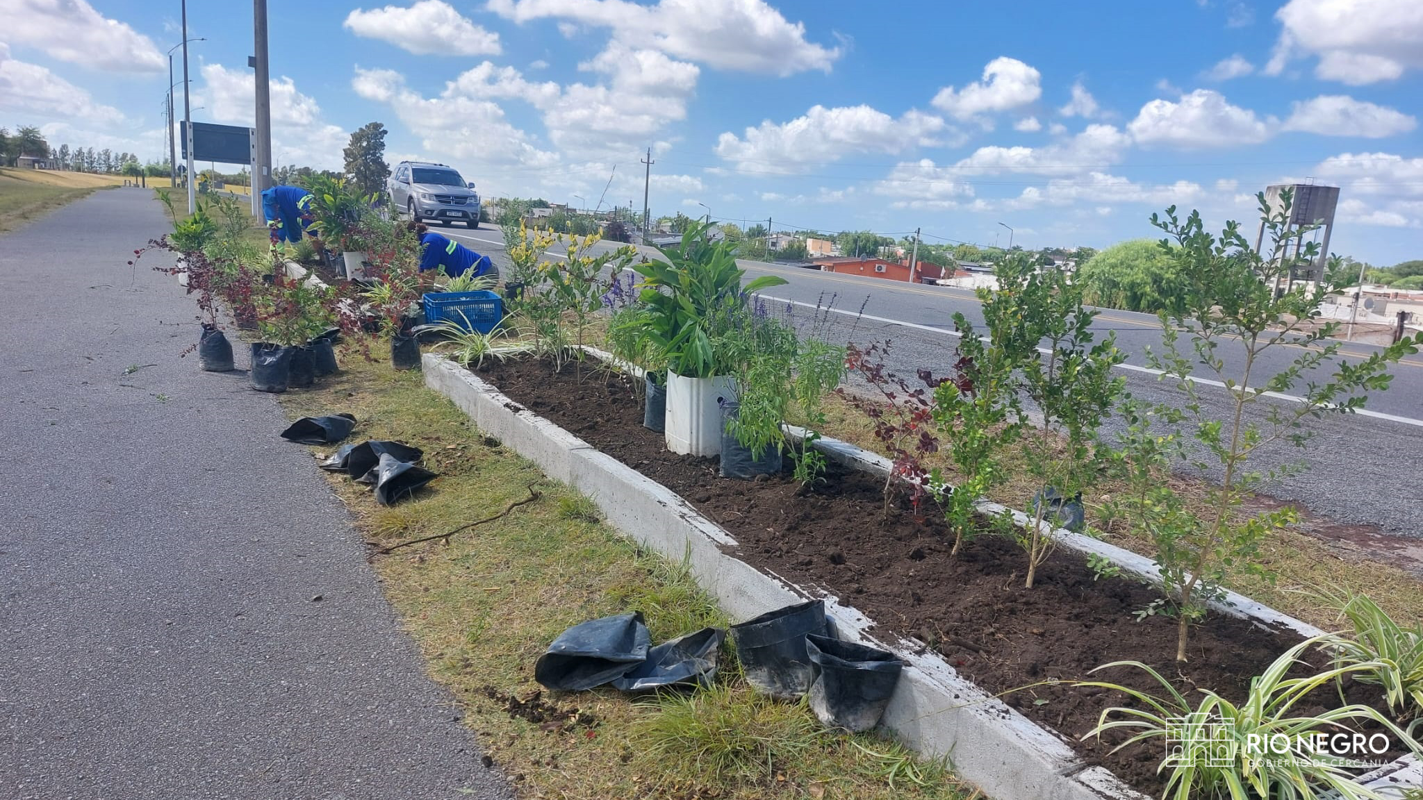 La Intendencia de Río Negro comenzó los trabajos de colocación de plantas y flores en la intersección de Ruta Vladimir Roslik y República de Chile, en el marco de las acciones de mejora en la ciclovía.