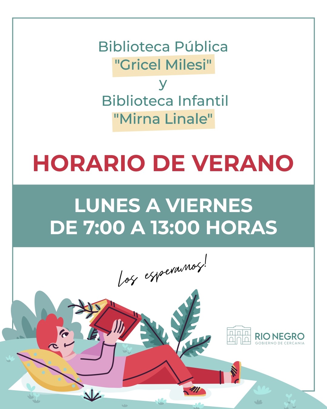 A partir del lunes 15 de diciembre de 2025, la Biblioteca Pública Gricel Milesi y la Biblioteca Infantil Mirna Linale comenzarán a funcionar en su nuevo horario de verano, con el objetivo de ofrecer un servicio accesible y cómodo para todas las familias, estudiantes y lectores de la comunidad.