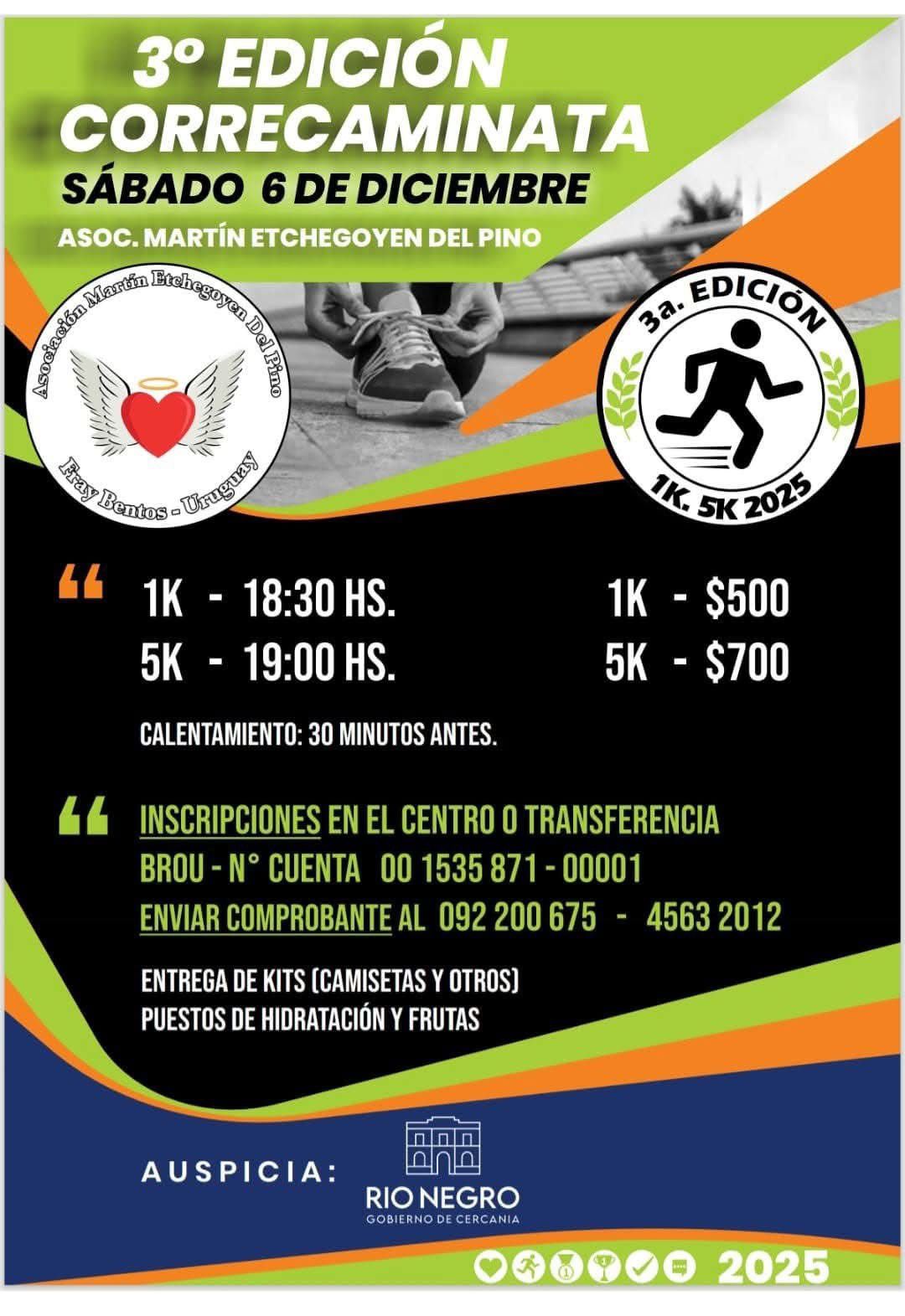 La Asociación Martín Etchegoyen del Pino organiza la 3ª edición de la Correcaminata, que se realizará el sábado 6 de diciembre. La actividad contará con dos modalidades: 1K (18:30 horas) y 5K (19:00 horas), ambas con una instancia previa de calentamiento.