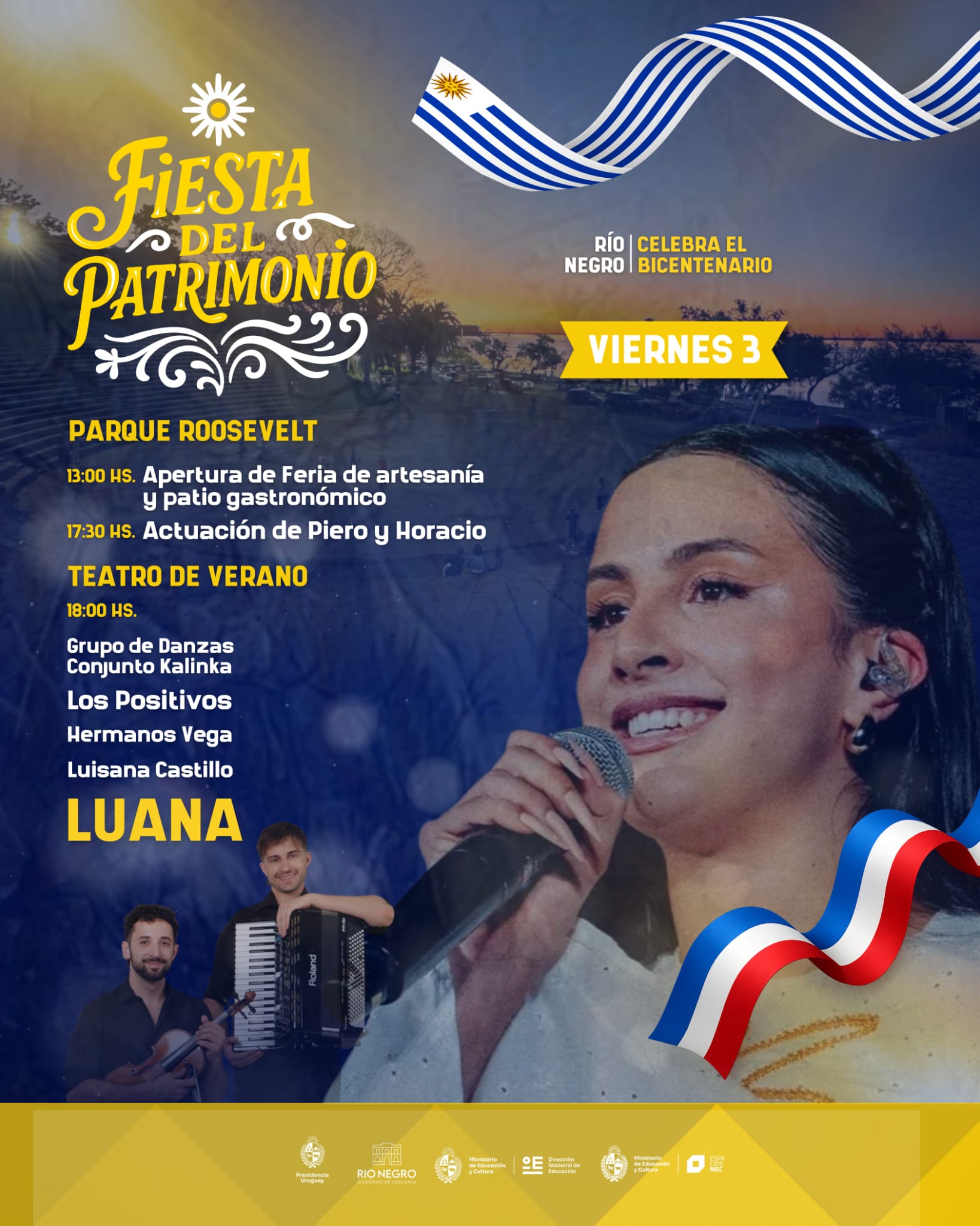 Uno de los puntos centrales será el Festival del Bicentenario, que se desarrollará el viernes 3 de octubre en el Parque Roosevelt y Teatro de Verano de Fray Bentos. El evento contará con una feria desde el mediodía y con la actuación central por la noche de Luana, la participación de artistas como Piero y Horacio, el Grupo Kalinka de San Javier, Los Positivos de Fray Bentos y Hermanos Vega de Nuevo Berlín.