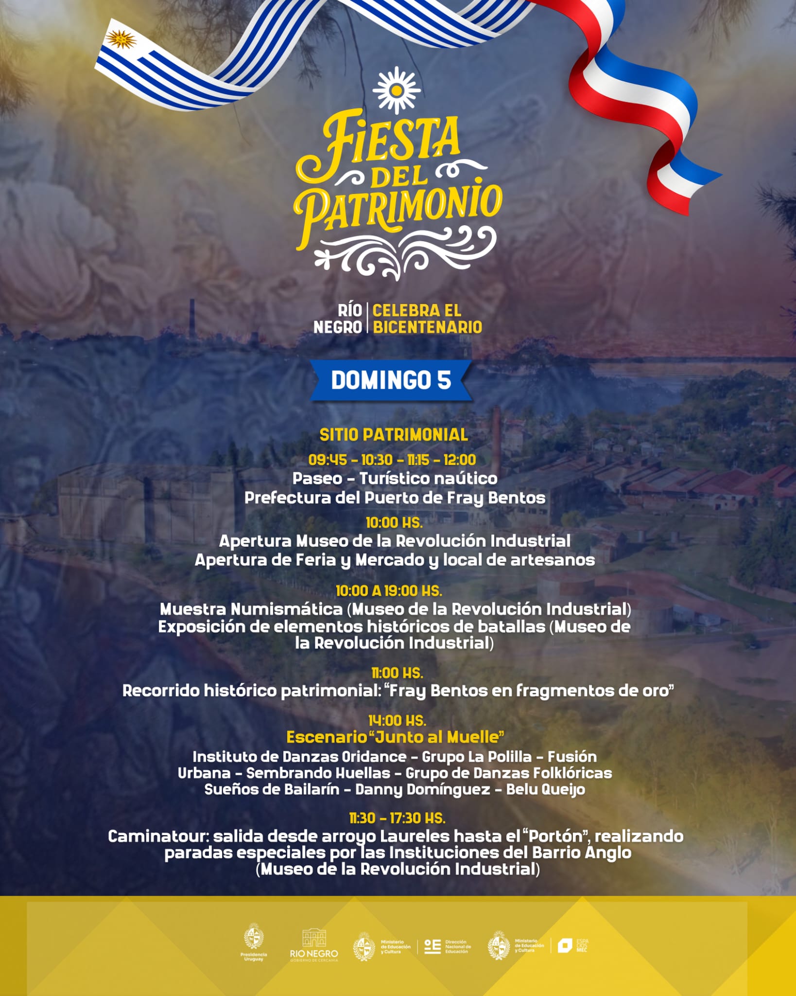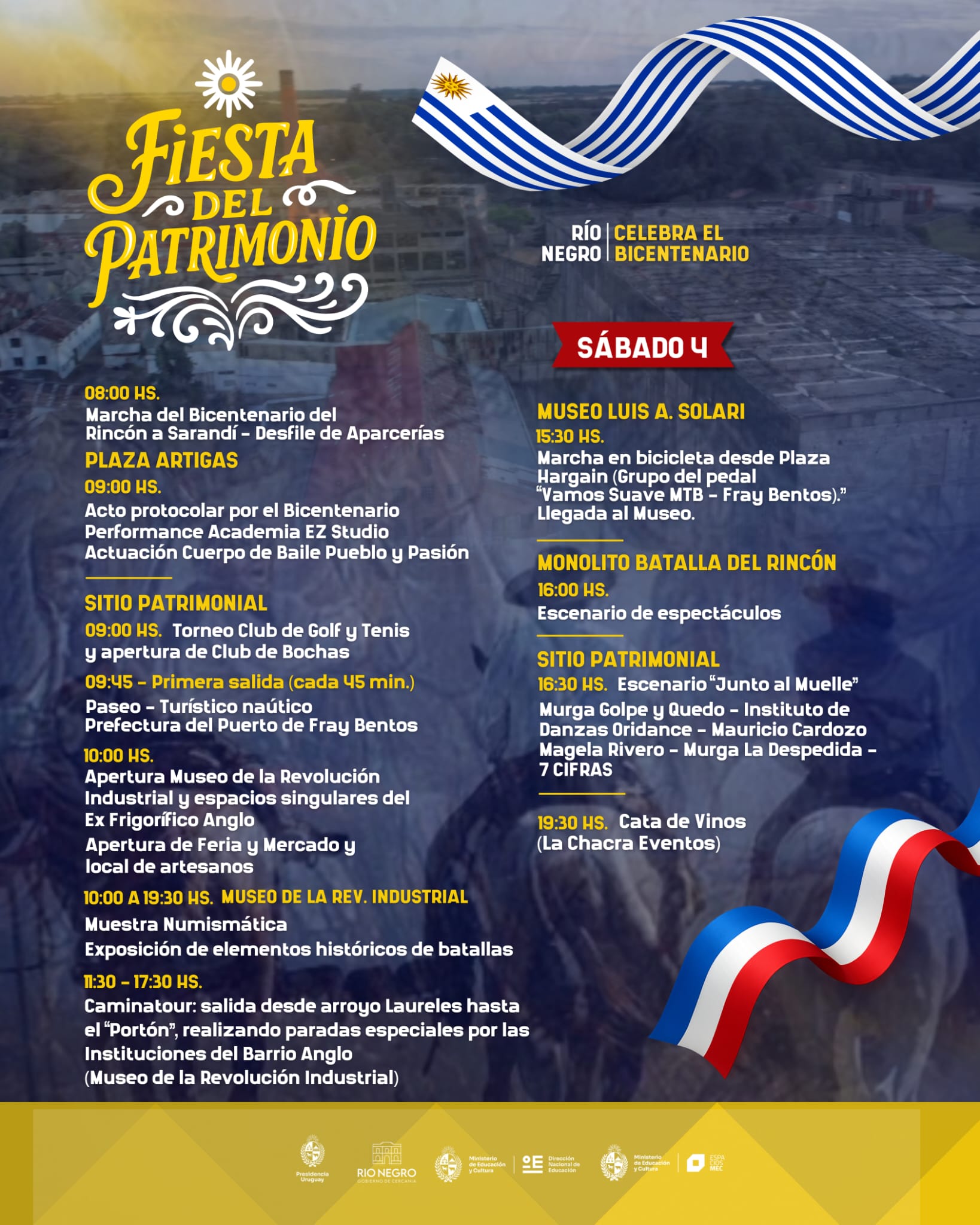 El sábado 4, las actividades comenzarán a las 8:00 con la Marcha del Bicentenario desde Rincón a Sarandí y el desfile de aparcerías. A las 9:00, en Plaza Artigas, se realizará el Acto Protocolar, y luego la fiesta continuará en el Sitio Patrimonial de la Humanidad – Paisaje Industrial Fray Bentos, con visitas guiadas por el barrio Anglo y el Museo de la Revolución Industrial.