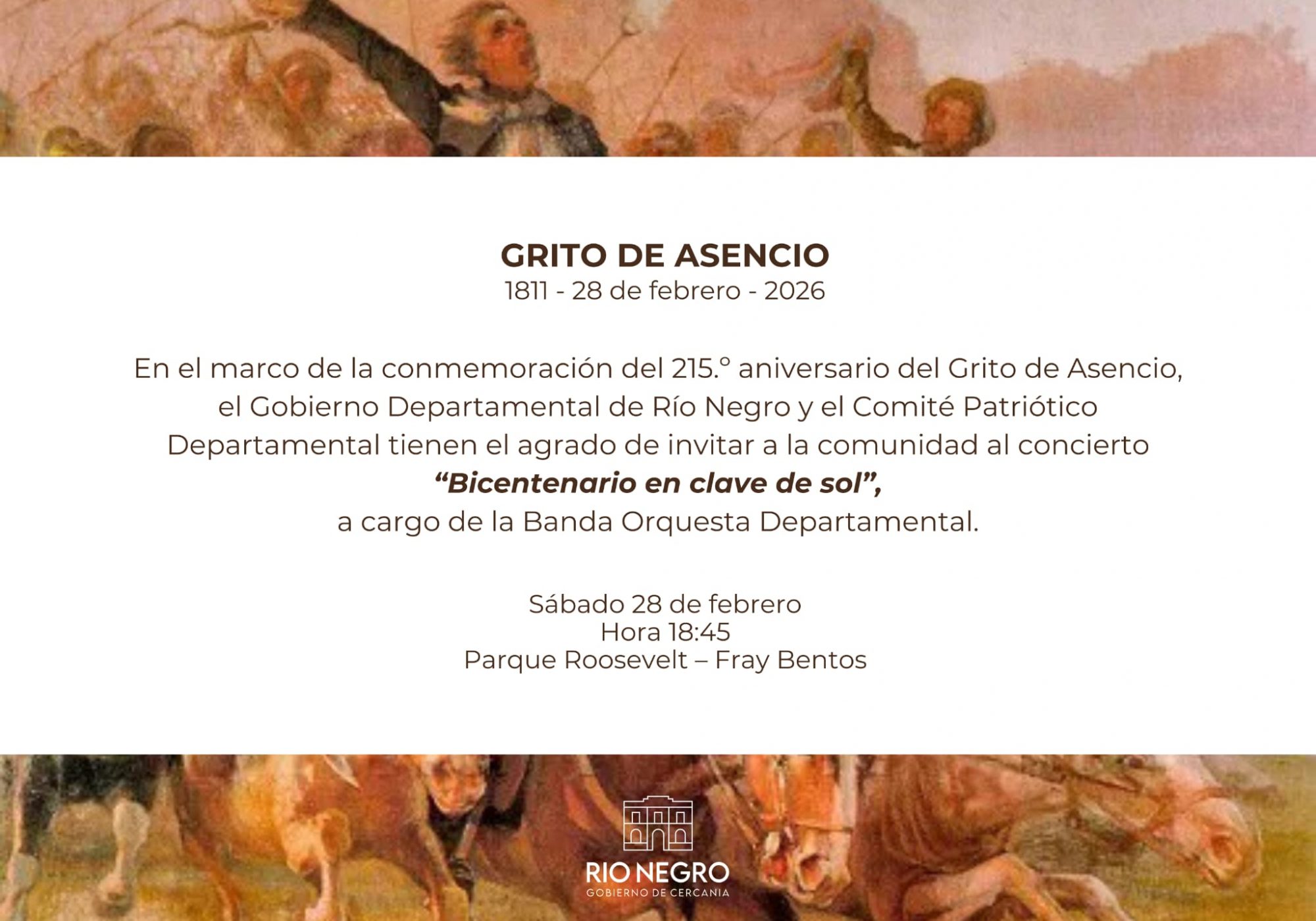 En el marco de la conmemoración del 215° aniversario del Grito de Asencio (1811 – 28 de febrero – 2026), el Gobierno Departamental de Río Negro y el Comité Patriótico Departamental invitan a la comunidad a participar del concierto “Bicentenario en clave de sol”, a cargo de la Banda Orquesta Departamental.