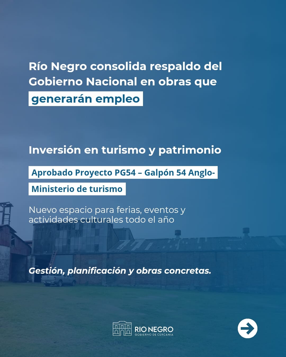 En paralelo, la Intendencia recibió la aprobación de una subvención del Ministerio de Turismo para el Proyecto PG54 – Plaza Pública Industrial Anglo (Galpón 54), en Fray Bentos. La iniciativa apunta a transformar el galpón en un espacio modelo y permanente, con cerramientos, acondicionamiento integral, instalaciones eléctricas adecuadas y equipamiento fijo, que permita albergar ferias, eventos, congresos, presentaciones de productos y actividades culturales durante todo el año .