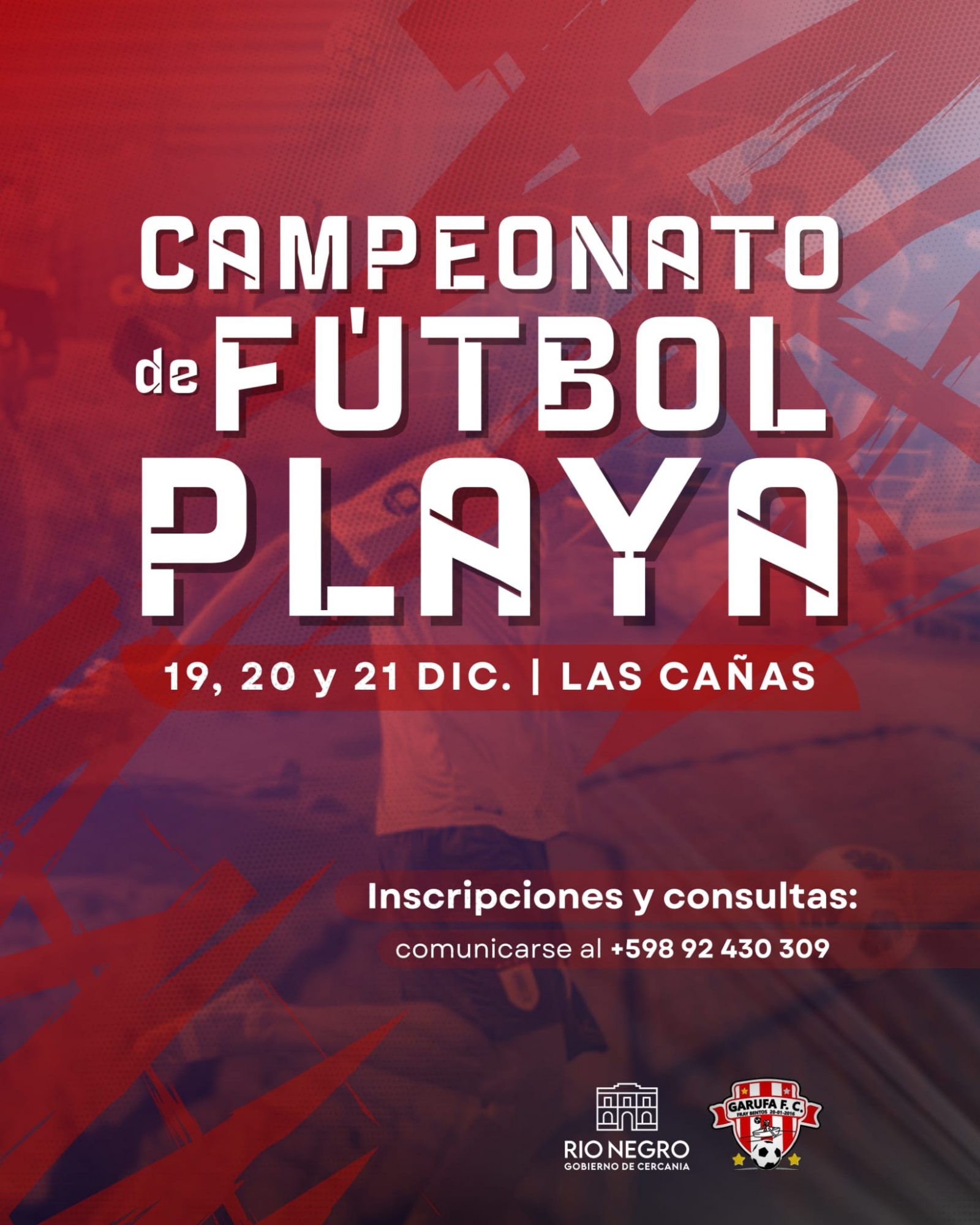 La Intendencia de Río Negro y el Club Garufa Futsal anuncian la apertura del período de inscripciones para el Campeonato de Fútbol Playa, que se desarrollará los días 19, 20 y 21 de diciembre en el Balneario Las Cañas.